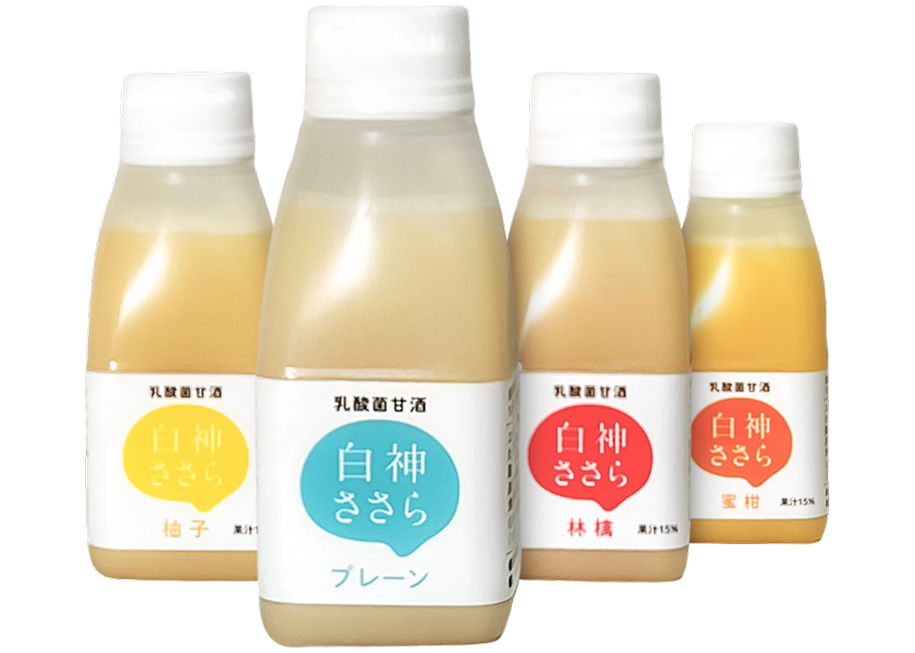 世界自然遺産白神山地から生まれた乳酸菌「白神ささら」と、秋田県産「あきたこまちの米糀」を仕込んだ、甘酸っぱくてフルーティーな乳酸発酵飲料です。お米の味がそのまま楽しめるプレーンの他に、国産果汁使用のりんご味、ゆず味、みかん味など多彩なラインナップを取り揃えております。